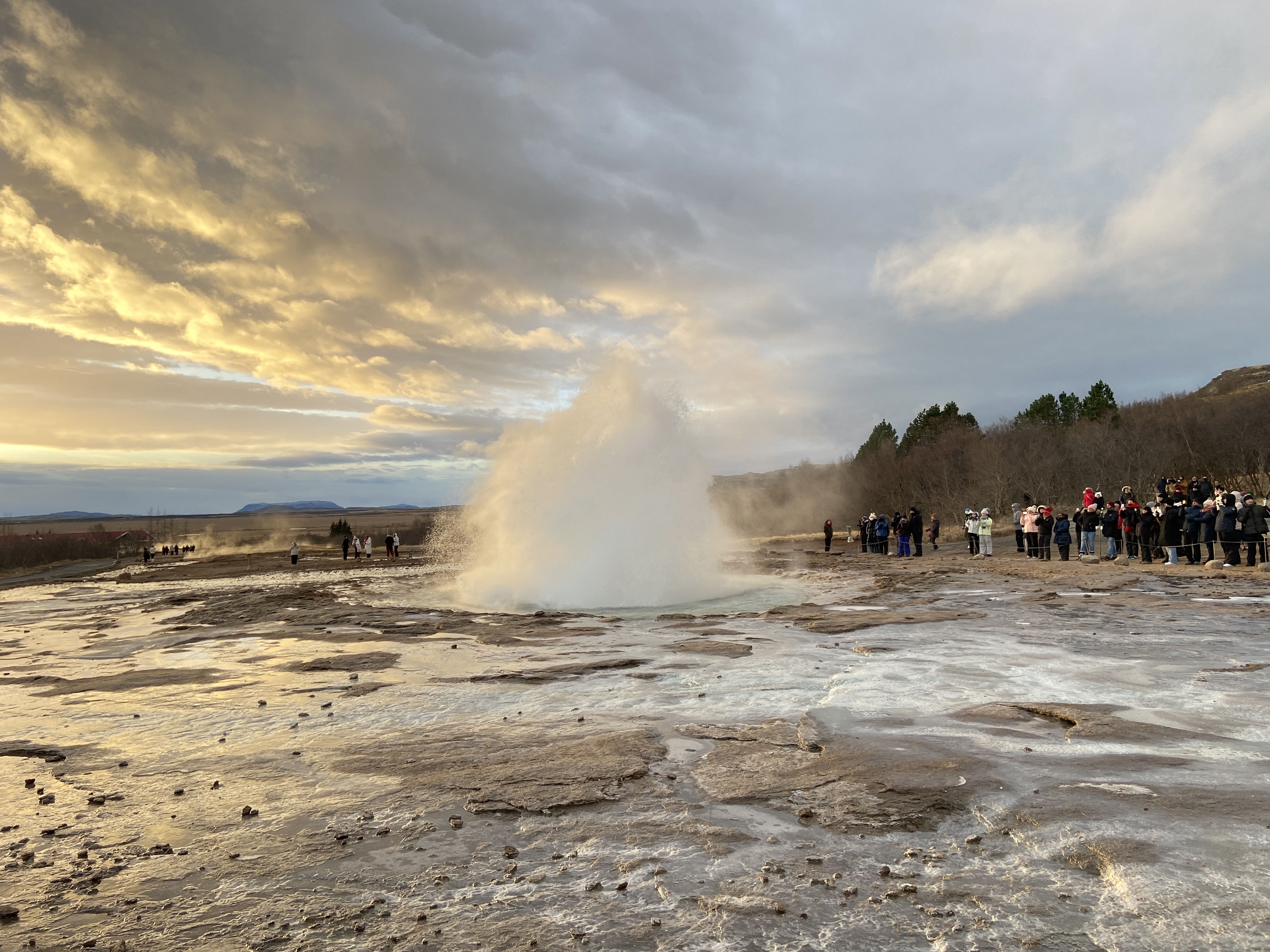 Geysir , sometimes known as The Great Geysir, is a geyser in south-western Iceland, that geological studies suggest started forming about 1150 CE. The English word geyser (a periodically spouting hot spring) derives from Geysir. The name Geysir itself is derived from the Icelandic verb geysa ("to go quickly forward"). Geysir lies in the Haukadalur valley on the slopes of Laugarfjall lava dome, which is also the home to Strokkur geyser about 50 metres (160 ft) to the south. The Strokkur geyser may be confused with it, and the geothermal field it is in is known usually as either Geysir or Haukadalur.
