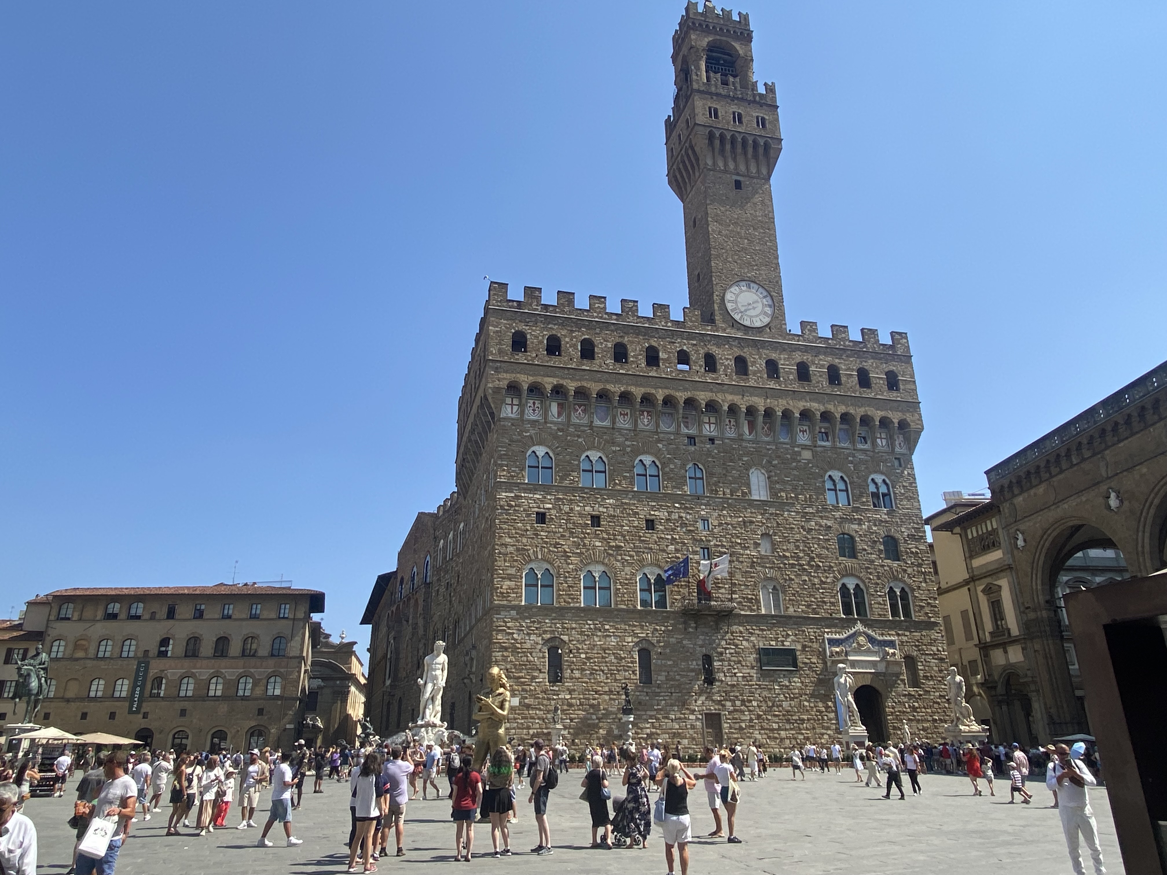 It is the "L"-shaped square in front of the Palazzo Vecchio in Florence, Italy, and still enjoys the reputation of the city's political center. There are many eye-catching statues on the square.