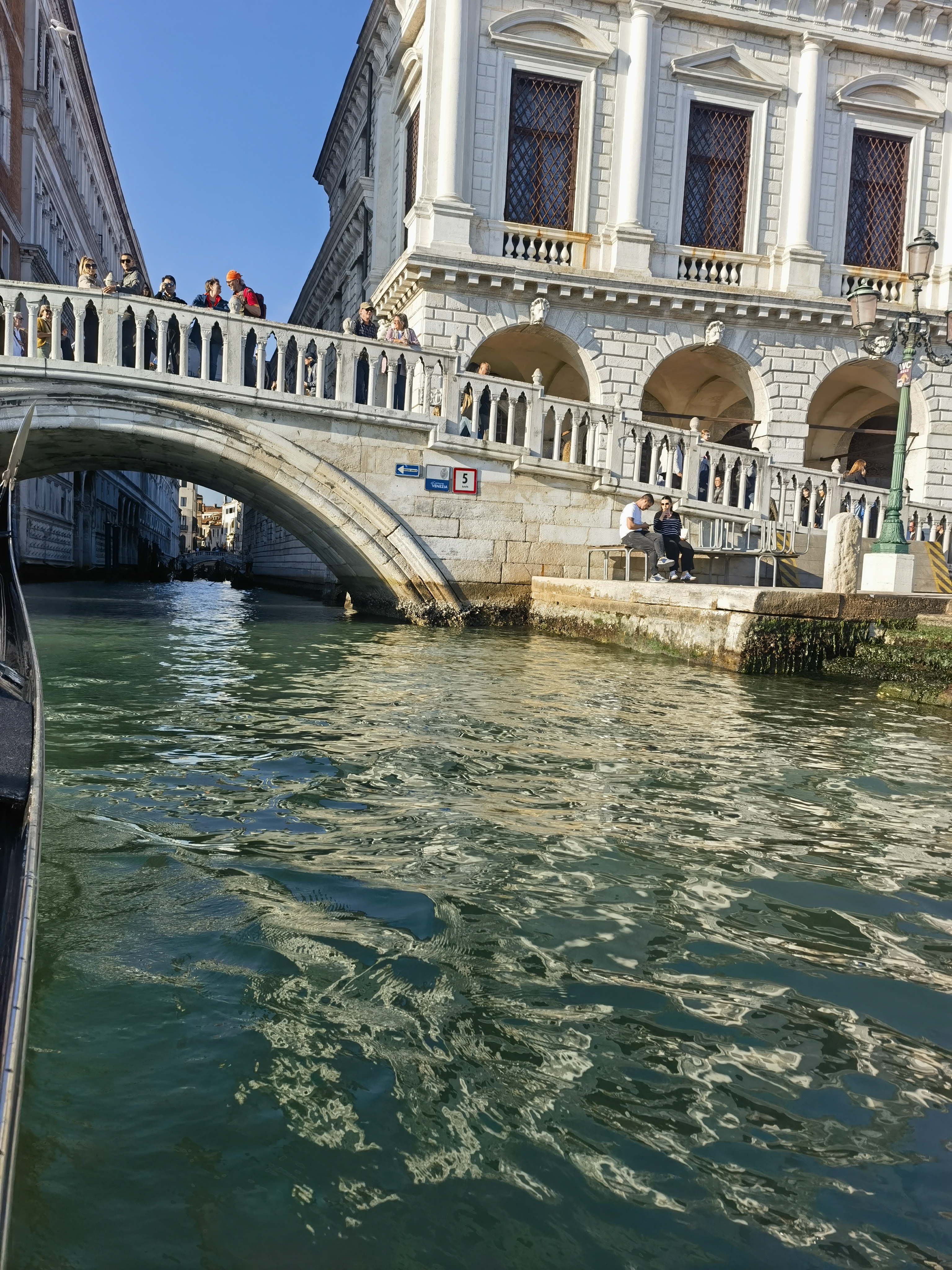 The enclosed bridge is made of white limestone, has windows with stone bars, passes over the Rio di Palazzo, and connects the New Prison (Prigioni Nuove) to the interrogation rooms in the Doge's Palace. It was built in 1600.The view from the Bridge of Sighs was the last view of Venice that convicts saw before their imprisonment. The bridge's English name was bestowed by Lord Byron in the 19th century as a translation from the Italian "Ponte dei sospiri", from the suggestion that prisoners would sigh at their final view of beautiful Venice through the window before being taken down to their cells.